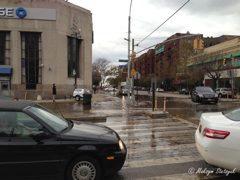 Як вам вже напевно відомо, на початку цього тижня, тобто вечором в понеділок 29 жовтня, буревій Сенді зійшов на сушу на півдні узбережжя штату Нью-Джерсі, що було трохи більше півтори сотні кілометрів від міста Нью-Йорк. Так як цей буревій був дуже масивним, він охоплював широкий радіус, що включав кілька штатів, куди звичайно і потрапляв Нью-Йорк. Навіть коли Сенді ще була десь навпроти берегів Вірджинії вдень ми вже починали бачити і відчувати її штормову погоду. Ще тоді океан став надзвичайно спіненим від сильних вітрів, котрі здіймали гребені хвиль.